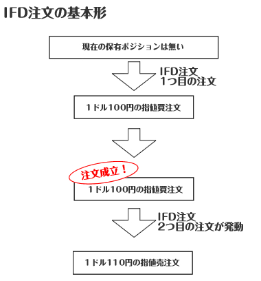 IFD注文とは(If Done注文)、もし成立したら○○という意味となります。新規の注文とそれが約定(成立)した場合の損切りの注文も自動的に可能となります。ある取引が成立した場合、に新しい注文を出すという注文方法で、たとえばドルを100円で買えたら、101円で売り注文を出すといった注文が可能な自動売買注文の一種です。